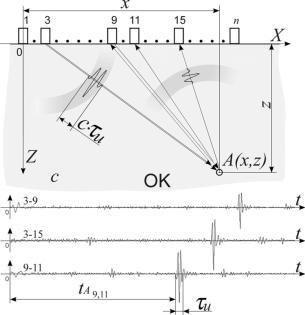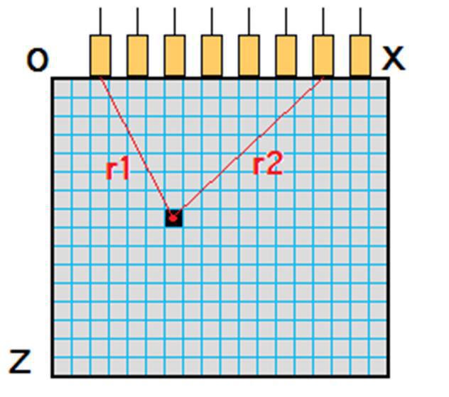 Для каждой точки томограммы из каждой принятой реализации выбираются короткие отрезки колебаний длительностью равной длине зондирующего импульса (c∙τi) (где с – скорость УЗ волны, τi – длительность зондирующего импульса) и временем пролёта УЗ импульса от излучившего зондирующий сигнал элемента решётки к визуализируемой точке материала ОК и обратно к приёмному элементу. Эти выбранные отрезки суммируются, и результирующая сумма (в виде такого же отрезка колебаний) записывается в отдельную ячейку памяти. Если в какой-либо визуализируемой точке ОК есть неоднородность материала, то эхосигналы от неё, присутствующие в каждой реализации, накапливаются (складываются в фазе) в ячейке памяти, соответствующей этой точке ОК. Если неоднородности нет, то в памяти накапливаются только колебания шумов (рисунок 2-7).