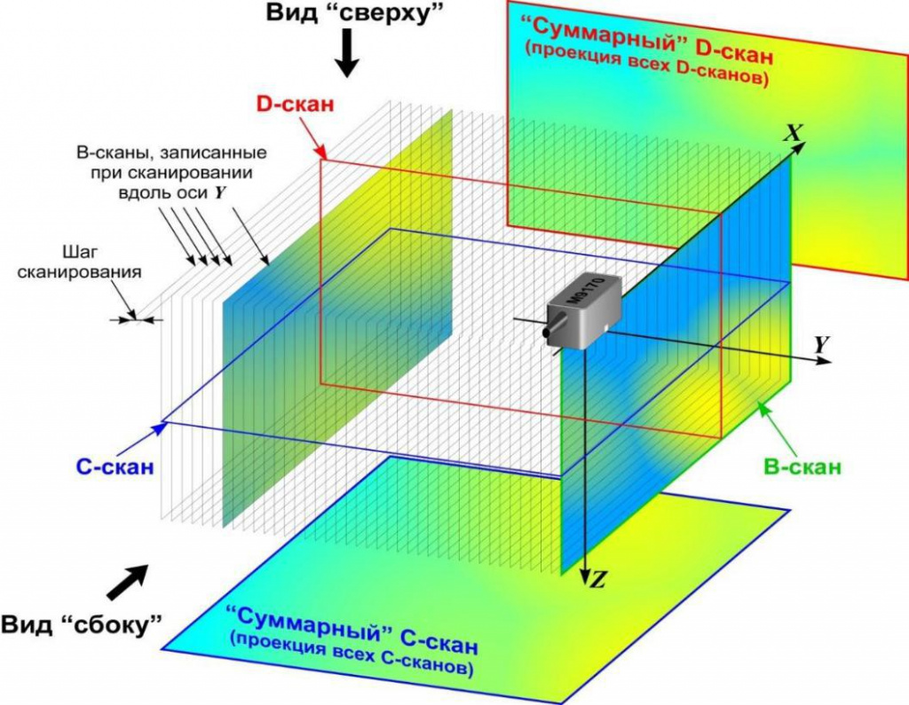 С-Скан – изображение вида «сверху». Оно представляет собой изображение сечения ОК, плоскость которого параллельна внешней поверхности ОК и расположена на некоторой выбранной глубине.