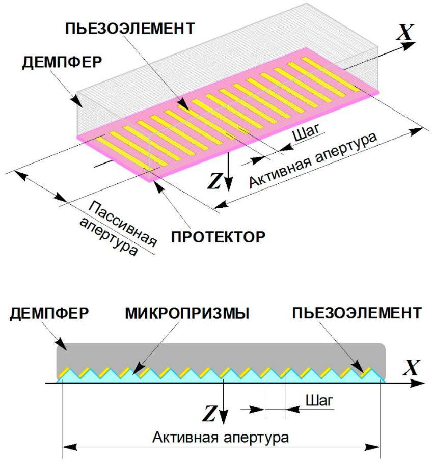 Рисунок 2-1 – Устройство антенных решёток. Прямая решётка продольных УЗ волн (вверху), наклонная решётка поперечных УЗ волн (внизу)