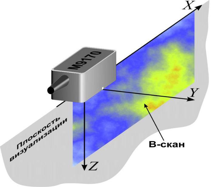Основной тип томограмм, который используется для анализа информации при ручном контроле – В-томограмма или В-Скан. Это изображение сечения ОК, плоскость которого перпендикулярна поверхности объекта и совпадает с продольной осью рабочей поверхности антенной решётки. В этой плоскости лежат акустические оси всех элементов решётки, и в этой плоскости происходит визуализация внутренней структуры ОК (рисунок 2-2).