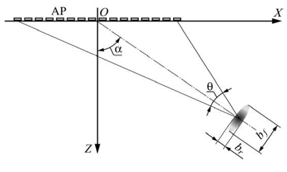 Главное значение имеет размер bf – фронтальный размер фокальной зоны в направлении перпендикулярном линии, проходящей через центр апертуры антенной решётки и точку фокуса. Именно этот размер зависит от фокусного расстояния и от угла α между нормалью к апертуре решётки и направлением на точку фокуса. Угол α назовем направляющим углом.