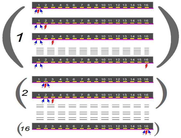 - и так до последнего 16-го элемента решётки, посылающего в ОК зондирующий импульс. Т. е. первый элемент решётки по очереди принимает УЗ сигналы от каждого элемента решётки.