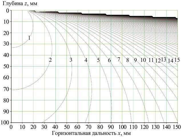 Видно, что с увеличением фокусного расстояния и направляющего угла α, размер bf фокальной зоны увеличивается. Так, например, в точке с координатами x = 140 мм и z = 65 мм фокальная зона равна 10,5 мм, а при той же глубине и x = 50 мм – порядка 2,9 мм. При углах α больше 80° даже при небольших расстояниях от АР параметр bf становится большой.