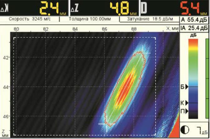 Рисунок 2-10 – Образ точечного отражателя (отверстия с полусферическим дном) на экране прибора. Образ оконтурен по уровню минус 6 дБ от его амплитудного значения