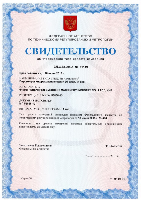 Поверка осуществляется по документу МП 53856-13 «Пирометры инфракрасные серий DT-xxxx, IR-xxx. Методика поверки», утвержденному ГЦИ СИ ФГУП «ВНИИМС», 18.04.2013г.