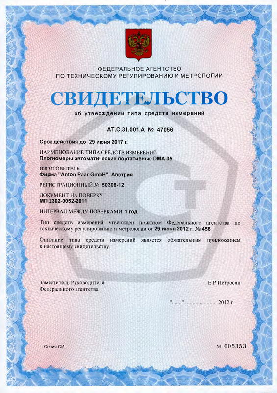 Поверка осуществляется по методике МП 2302-0052-2011 «Плотномеры автоматические портативные DMA 35. Методика поверки», утвержденной ГЦИ СИ ФГУП «ВНИИМ им. Д.И. Менделеева» 22.09.2011 г. Основные средства поверки: Анализатор плотности жидкостей типа DMA4100, гос.реестр №39787-08 или аналогичный. Пределы допускаемой абсолютной погрешности измерения плотности ± 1,0 10-4 г/см3