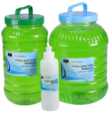 Гель МИАСС-110 используется для создания качественного контакта ультразвукового преобразователя с изделием. Гель представляет собой коллоидный раствор силиконовых полимеров в воде. Для его производства используются материалы, применяемые в аэро-космической отрасли.