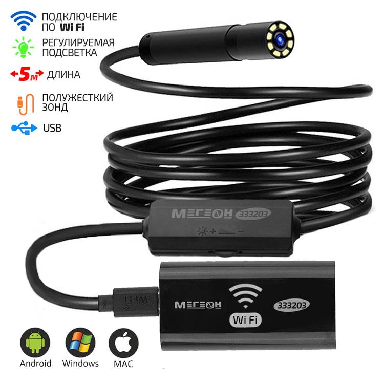 МЕГЕОН 333204 - это видеоскоп с беспроводной передачей данных при помощи Wi-Fi. Прибор удобен своей возможностью работать с большим количеством мобильных средств связи. Теперь размер изображения зависит только от диагонали экрана личного смартфона или планшета. Программное обеспечение позволяет эксплуатировать совместно с операционными системами на базе Android, IOS и Windows. Необходимое приложение доступно для скачивания без ограничения в Play Market, APP Store и на сайте компании. Для работы с персональным компьютером требуется обязательное наличие функции Wi-Fi. Передатчик эндоскопа обеспечивает связь устройств на расстоянии от 5 до 30 метров. Видеонаблюдение обеспечивается пыле- влагозащищённой камерой диаметром 8 мм. Яркая светодиодная подсветка высокой интенсивности гарантирует прекрасную видимость в полном отсутствии освещения.