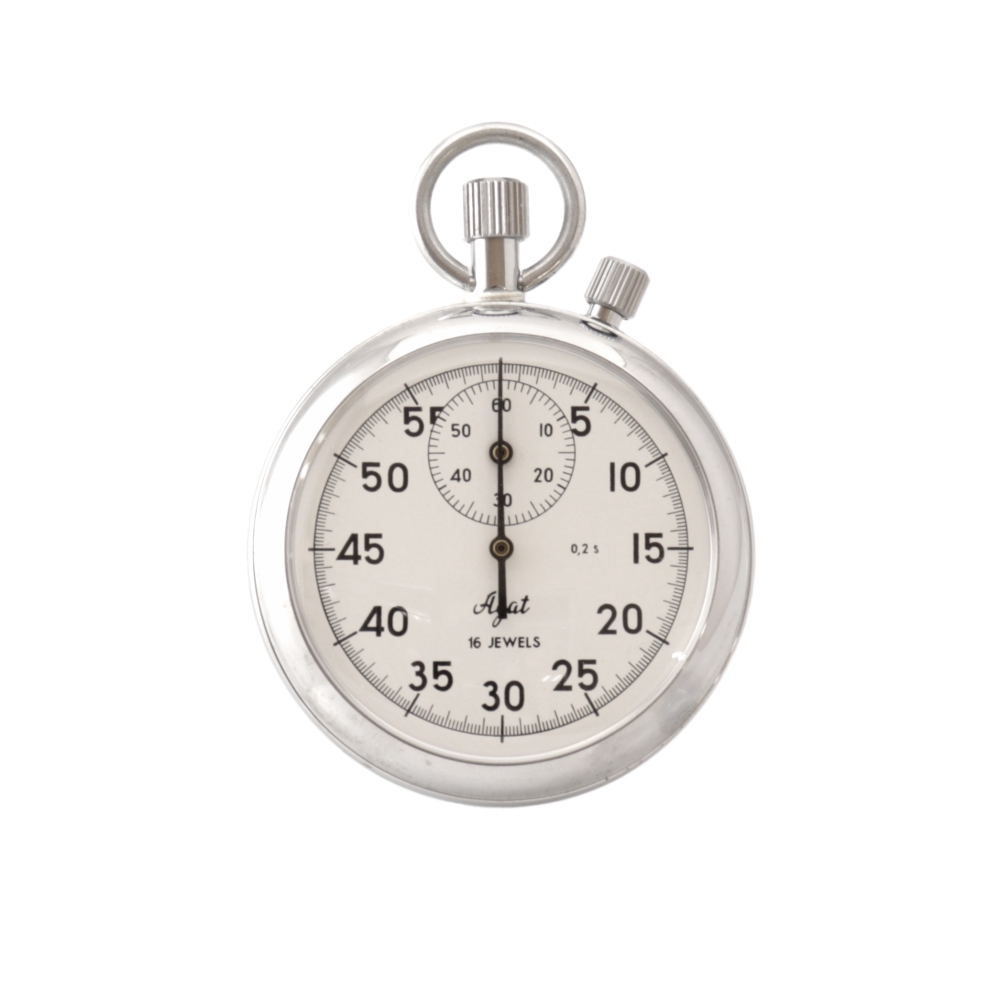 Отсчет времени в секундомере ведется стрелкой по 60-секундной шкале с ценой деления 0,2 секунды. Одновременно с этим производится измерение в минутах на вспомогательном маленьком циферблате. Высокая точность измерений обеспечивается за счет оснащения колебательной системой “баланс-спираль”, используемой в карманных часах, с интервалом 0,4 секунды. Для большей наглядности циферблат и стрелки выполнены в контрастном с остальным корпусом черном исполнении.